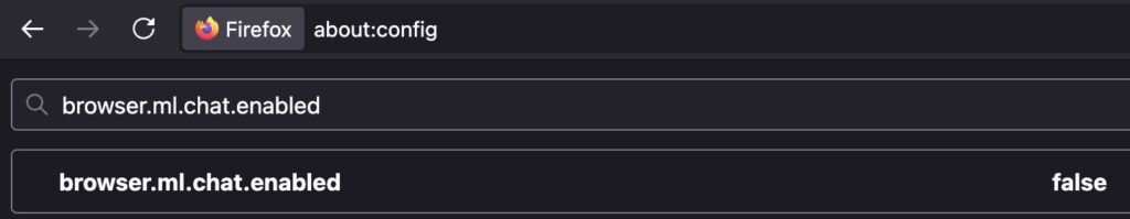 browser.ml.enable→ désactive toutes les fonctions globales de machine learning (IA) intégrées à Firefox.browser.ml.chat.enabled→ désactive le chatbot IA intégré dans le navigateur.browser.ml.chat.menu→ supprime l’option liée au chatbot dans le menu contextuel (clic droit).browser.ml.chat.page→ désactive les outils IA présents directement sur les pages web, comme le résumé automatique ou les suggestions.browser.ml.chat.page.footerBadge→ masque l’icône ou le badge IA affiché en bas des pages web.browser.ml.chat.page.menuBadge→ supprime le badge IA visible dans les menus du navigateur.